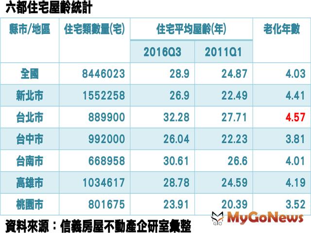 【MyGoNews蕭又安/綜合報導】根據內政部不動產資訊平台資料顯示,台北市2016年住宅平均屋齡已經達到32.28年,若和2011年的第一季相比,5年半的時間台北市住宅平均屋齡老化約4.57年,老化速度位居六都之冠,平均住宅屋齡最年輕的則是桃園市,平均住宅屋齡為23.91年,過去5年半的時間平均住宅屋齡僅老化約3.5年。