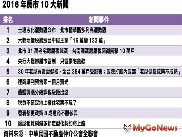 【MyGoNews蕭又安/綜合報導】中華民國不動產仲介經紀商業同業公會全國聯合會2016年12月19日舉辦年終記者會,選出2016年度房地產市場10大新聞,全聯會表示,2016年即將進入尾聲,國內房市雖信用管制已大多解除,但因房地合一稅上路、持有稅增加,2016年房市出現嚴重窒息量,全年建物買賣移轉棟數將創下有紀錄以來新低量。全聯會由全國各縣市公會理事長票選出2016年度房地產市場10大新聞之首,就是土壤液化潛勢區公布,北市精華區多列高潛勢區。全聯會也預估2017年度總推案金額將與2016年度持平,維持9,000億推案量,而「產品力」與「付款靈活度」將是左右各新推各案能否脫穎而出的重要關鍵。 2016年即將結束,國內房市景氣持續低迷,全年房屋交易量恐將創下24萬棟的新低量,這市況房仲業者感受最深刻,中華民不動產仲介全聯會縣市公會理事長們認為,「政策」、「稅制」仍是干擾2016年房市最主要的因素,其中首度公布的土壤液化潛勢區,因北市精華區多位居高潛勢區,讓民眾大感訝異,榮登年度10大新聞之首。 中華民國不動產仲介公會全聯會從2013年開始由全國各縣市理事長票選房市年度10大新聞,以判斷主要年度房地產新聞事件對於市場的影響程度,2016年干擾房市的新聞事件仍然很多,在諸多新聞事件當中,由全國各縣市理事長票選出前五名分別為:土壤液化潛勢區首度揭露、六都地價稅暴漲、老屋房屋稅喊漲並回溯、豪宅信貸持續管制、老屋健檢政策等(詳如附表)。 檢視全聯會票選出的2016年房市10大新聞,幾乎仍與政府政策有關,房仲業者普遍認為,即使2016年央行已大多解除信用管制的利多(僅剩豪宅信貸管制尚未解除),但整體房市還是有被政策打敗的情形。